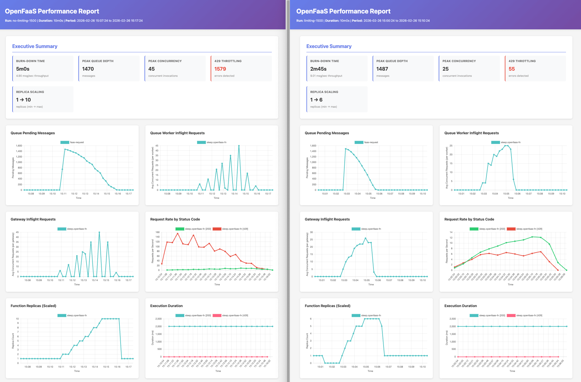 429response rate stays low throughout — the queue-worker throttles dispatch to match capacity rather than flooding the function with requests.